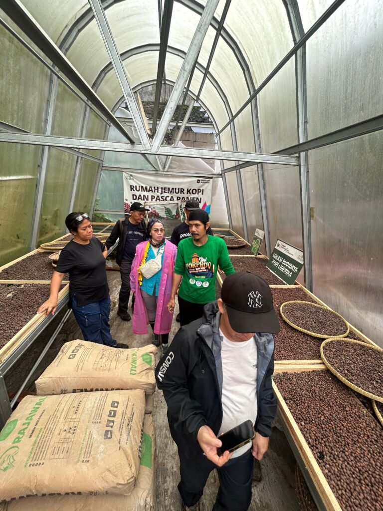 Setelah makan siang, tiba saatnya kami mencicipi berbagai jenis kopi hasil dari hutan kopi di sini. Kami pun dibawa ke rumah produksi, yang memiliki berbagai alat pengolah biji kopi serta tempat menjemur kopi yang sudah dipanen.