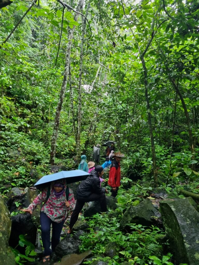 Rombongan kami yang berjumlah 16 orang pun mulai diajak berjalan memasuki hutan di belakang kampung. Hutan Talun atau hutan Perkebunan ini terlihat cukup rapat, terdiri dari berbagai jenis pohon, dari Kopi, Mahoni, Cengkeh, Mangga, Jambu Batu, Jambu air, dan lain sebagainya.