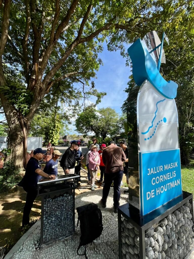 Tujuan berikutnya yang kami datangi adalah Kawasan Banten lama. Kami bergerak ke arah benteng Speelwijk, dengan sebuah tugu yang baru diresmikan, yang diduga menjadi tempat masuknya Cornelis de Houtman atau Belanda pertama kali ke bumi Indonesia pada tahun 1596. Setelah berfoto di depan tugu, kami pun bergerak memasuki komplek benteng Speelwijk. Sayangnya di bagian luar benteng, suasana sangat riuh dengan berbagai pedagang makanan dan penyewaan mainan anak, sehingga membuat nilai sejarah tempat ini berkurang.