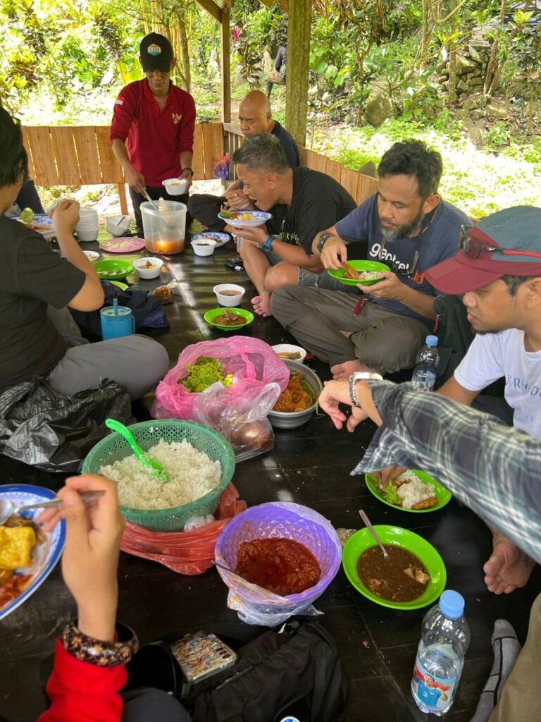 Tidak lama, datanglah makan siang berupa nasi panas, semur jengkol, tahu tempe, sambal, lalab dan ikan goreng. Sungguh menggiurkan ditengah lelahnya kami setelah menembus hutan dan menerjang hujan.